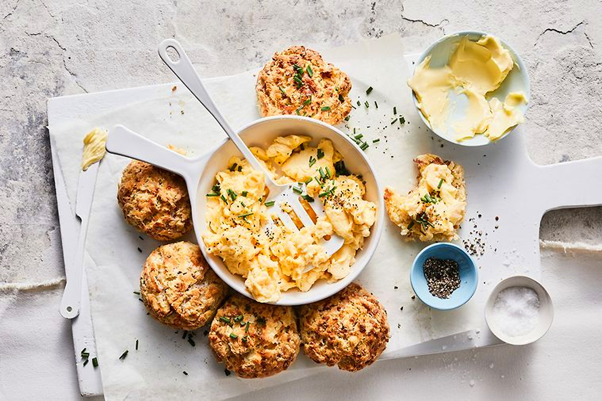 Rozgrzać piekarnik do 200 st. C. Wyłożyć blachę papierem do pieczenia. Rozgrzać olej na patelni dodać boczek i smażyć przez 3-4 min. Odsączyć na ręczniku papierowym. Wsypać mąkę, tymianek, 1 łyżeczkę soli morskiej i dużo świeżo zmielonego czarnego pieprzu do dużej miski. Dodać masło i ser, a następnie wymieszać nożem do masła. Dodać mleko i boczek, a następnie wymieszać, aby uzyskać miękkie, puszyste ciasto. Przełożyć na lekko posypaną mąką powierzchnię i ugniatać delikatnie, aż będzie gładkie. Podzielić ciasto na 6 równych porcji i delikatnie rozwałkować, aż będzie gładkie. Ułożyć je w formie pierścienia, w odległości ok. 2 cm od siebie. Posmarować wierzch dodatkowym mlekiem i posypać dodatkowym serem Gruyère i tymiankiem. Doprawić. Piec przez 25-30 min., aż wyrosną i nabiorą złocistego koloru, ostudzić na kratce przez 15 min., a następnie przekroić na pół. Włożyć jajka i śmietanę do dużej miski i ubić, a następnie doprawić do smaku. Rozpuścić masło na dużej patelni, wlać mieszankę jajeczną i smażyć, od czasu do czasu mieszając, przez 2-4 min., aż jajka się zetną. Podawać bułeczki z jajecznicą i szczypiorkiem.