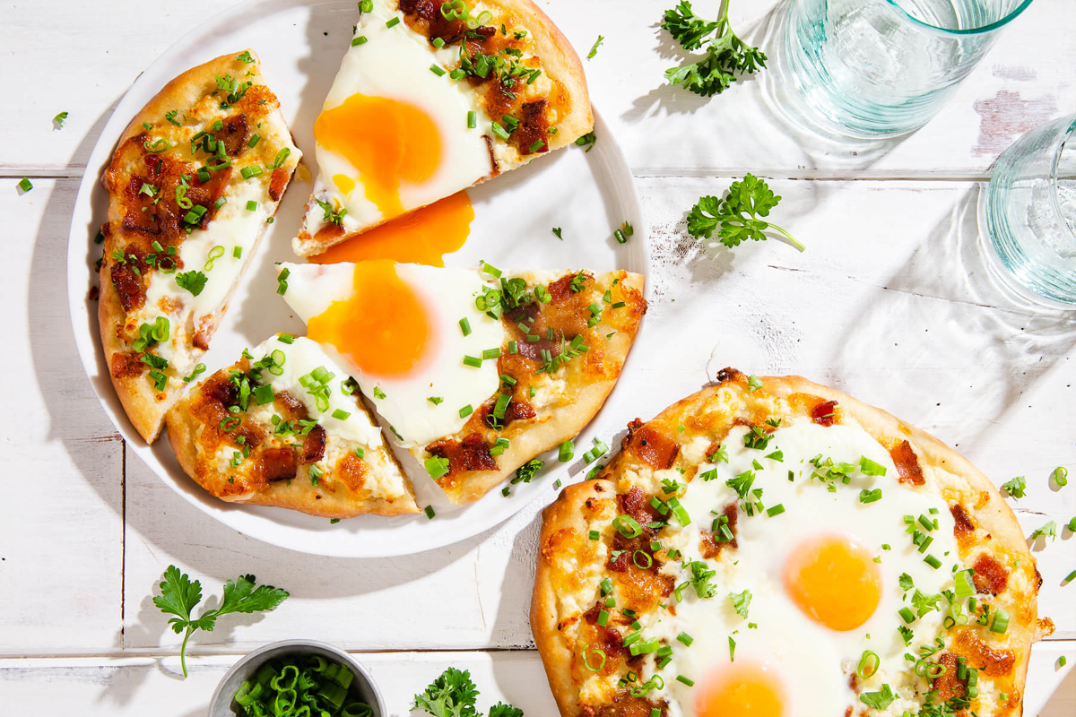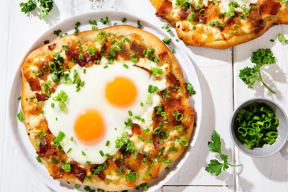 Na każdą pizzę nałożyć około 1/4 mieszanki ricotty, 1/4 sera mozzarella i 1/4 boczku. Piec aż ciasto i ser zaczną się rumienić, ok. 20 min. Wyjąć formę z piekarnika i wbić dwa jajka w środek każdej pizzy. Ostrożnie włożyć formę z powrotem do piekarnika i piec przez kolejne 8-10 min. Wyjąć formę z piekarnika i posypać każdą pizzę pietruszką, szczypiorkiem i dymką.