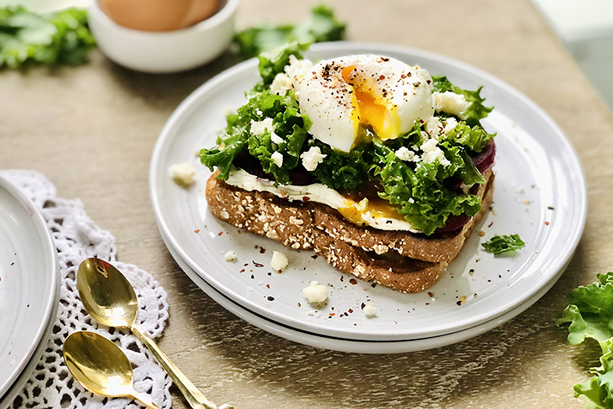 Zagotować wodę w garnku i dodać 2 łyżki białego octu. Łyżką stworzyć wir we wrzącej wodzie, mieszając ją okrężnymi ruchami. Wbić jajko na środek wiru, po 4 min. wyjąć jajko. Powtórzyć. Opiec chleb, posmarować wierzchnią warstwę tostu warstwą serka śmietankowego, a następnie ułożyć na niej plastry buraków. Jarmuż wymieszać z sosem i położyć na tosty. Posypać serem feta i położyć na wierzchu jajko w koszulce. Posypać płatkami czerwonej papryki.