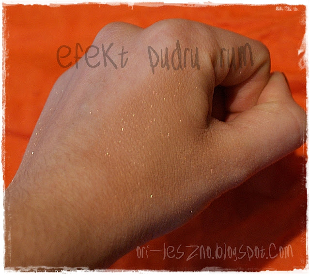 Po zaaplikowaniu pudru Rum, zobaczyłam, że zawiera wiele drobinek, mieniących się delikatnie. Zdziwił mnie więc opis producenta