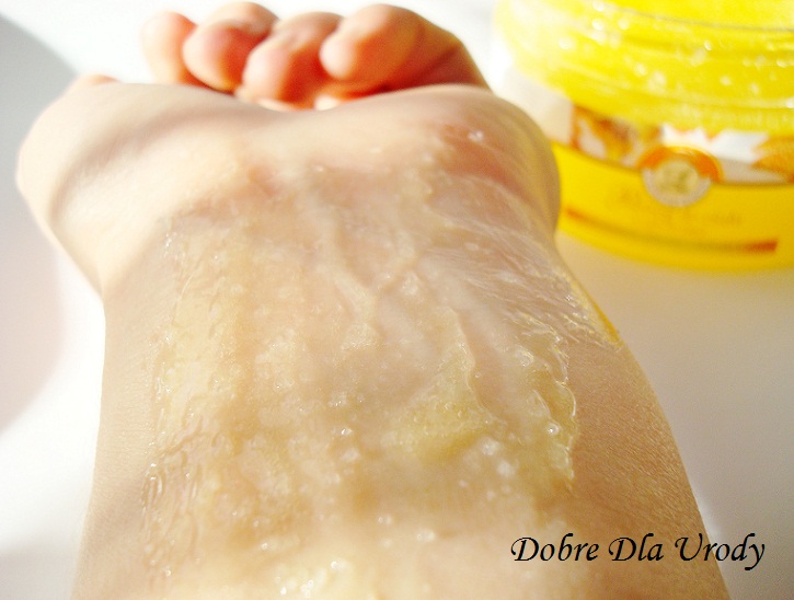 Peeling o jaskrawej, żółtej, słonecznej barwie i półpłynnej ( niczym tężejąca galaretka ) jednolitej konsystencji wypełnionej drobnymi pęcherzykami oraz kryształkami o średniej wielkości – ogólnie wygląda bardzo apetycznie, smakowicie, rzeczywiście niczym galaretka lub mus owocowo – bąbelkowy :)