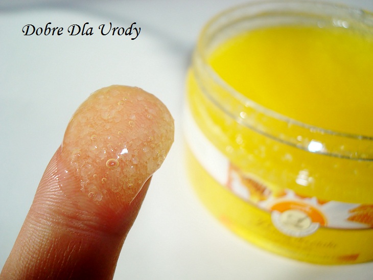 Peeling już samym swoim słonecznym kolorem poprawia nastrój i zachęca do używania, szaruga za oknem i zimno na dworze sprawia, że chce się czegoś ciepłego i miłego, a tu takie ” słoneczko ” z miodowo – mlecznym akcentem na opakowaniu – zmysły już działają pobudzająco…