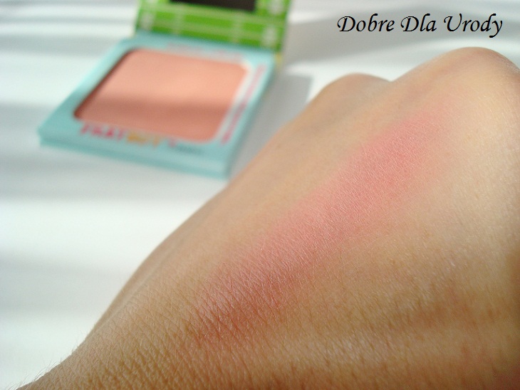 Aplikacja różu jest bardzo wygodna, jest zbity, ale rewelacyjnie nabiera się na pędzel, nie pyli się wcale, co też bardzo lubię. Kolorystycznie jest to odcień brzoskwiniowy, owszem, ale z przewagą różowych pigmentów, a nie pomarańczowych, co mi bardzo odpowiada.