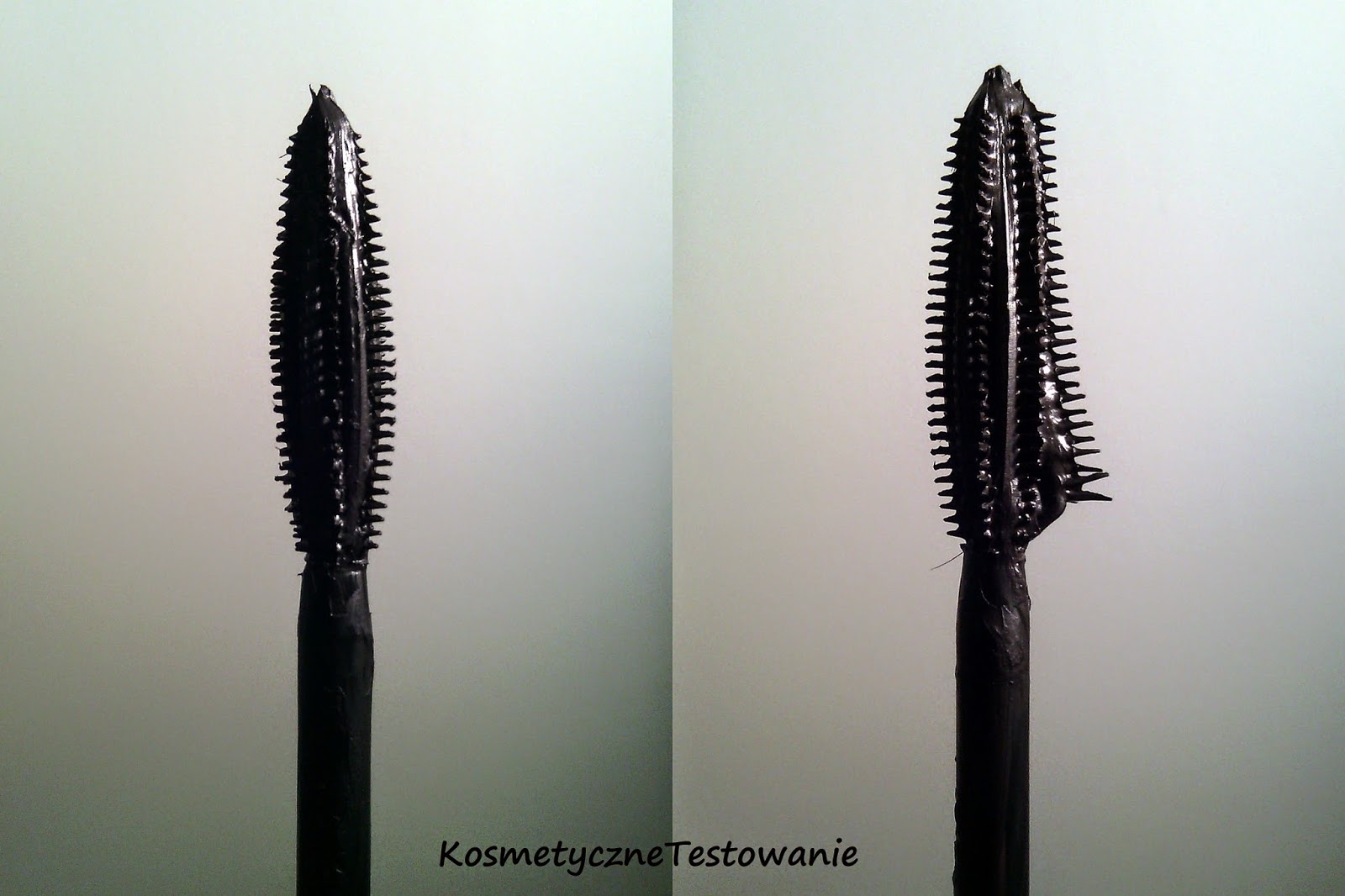 Po użyciu (jak widać na zdjęciu) rzęsy są wydłużone, rozdzielone,podkręcone i mają głęboki czarny kolor.