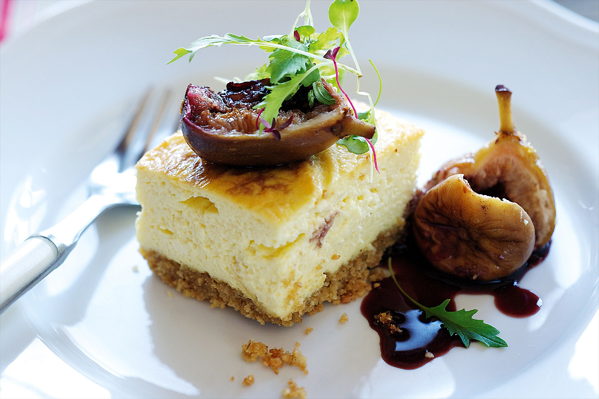 Rozgrzać piekarnik do 180 st. C. Nasmarować i wyłożyć papierem do pieczenia dno kwadratowej formy o średnicy 21 cm (lub użyć okrągłej formy o średnicy 24 cm). 2. Zmiksować ciastka w robocie kuchennym na drobne okruszki. Dodać starty parmezan i roztopione masło, a następnie zmiksować pulsacyjnie. Równomiernie wyłożyć masę na dno przygotowanej formy. Piec przez 15 min. do momentu, aż masa będzie twarda i lekko złota, a następnie pozostawić do ostygnięcia, przygotowując nadzienie. Umieścić serek śmietankowy w robocie kuchennym i zmiksować na gładką masę. Dodać jajka i gorgonzolę i zmiksować na gładką masę. Doprawić solą i świeżo zmielonym czarnym pieprzem. Wylać masę serkową na ostudzony spód i piec przez 25 min. Lekko ostudzić, a następnie przejechać nożem wzdłuż krawędzi formy. Oddzielić boki, pozostawiając ciasto w formie, i schłodzić przez co najmniej 2 godz. do momentu, aż masa stwardnieje i stężeje. Umieścić wino, cynamon i cukier na patelni i zagotować na małym ogniu. Mieszać, aby rozpuścić cukier, a następnie gotować na wolnym ogniu przez 10 min. do momentu, aż płyn odparuje o połowę. Dodać figi do rondla i gotować na wolnym ogniu przez 3 min., aż zmiękną. Wyjąć figi i gotować płyn na wolnym ogniu przez 3-4 min., aż zgęstnieje i nabierze konsystencji syropu. Przełożyć figi z powrotem do rondla i wmieszać ocet. Pozostawić do ostygnięcia. Pokroić ciasto w kwadraty lub plasterki, a następnie udekorować figami gotowanymi w barolo i mikrolistkami sałaty.