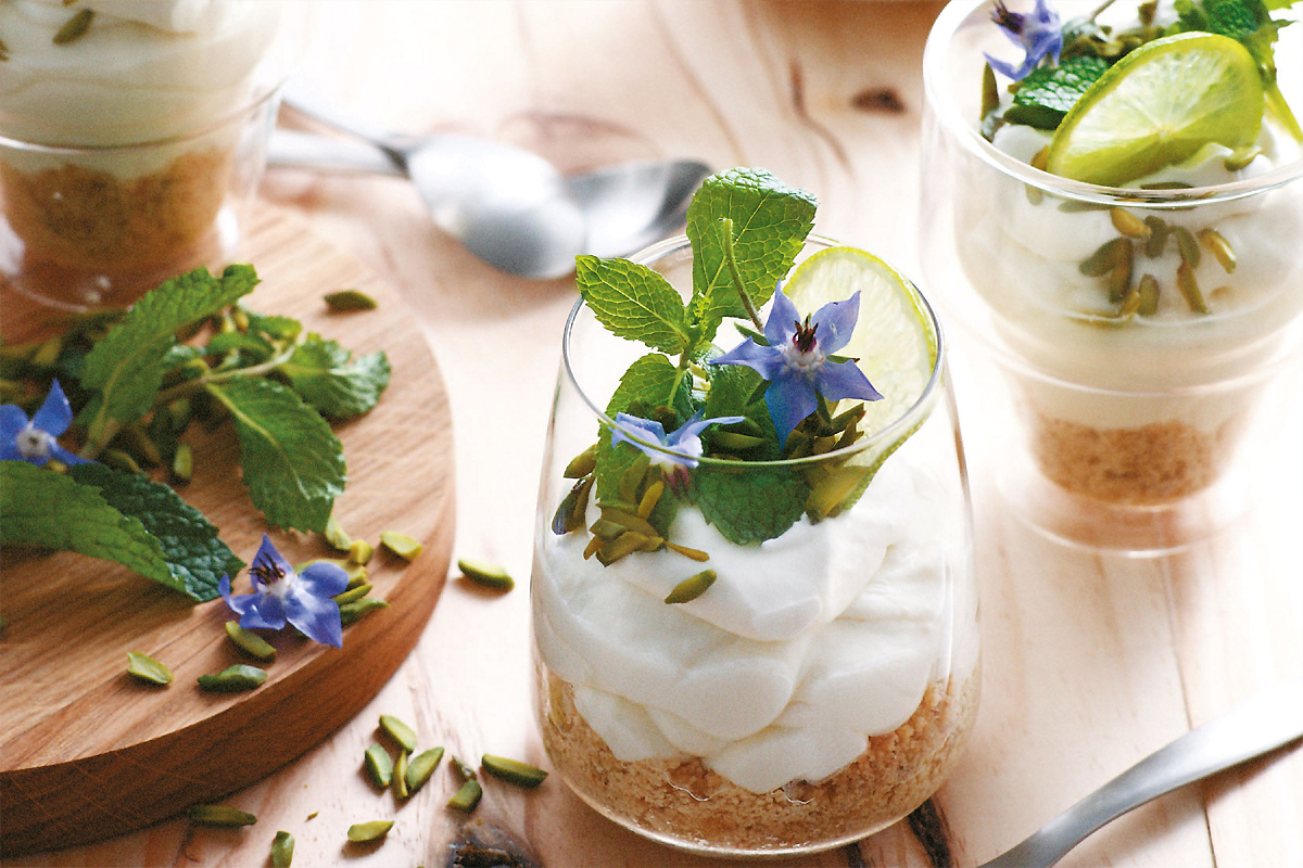 Wymieszać roztopione masło z pokruszonymi ciasteczkami. Wcisnąć masę na dna 6 szklanek (dobrze ubić ją patyczkiem do koktajli lub końcem wałka do ciasta). Schłodzić w lodówce. Zagotować cukier i 1/4 szklanki (60 ml) wody w rondlu, mieszając, aby rozpuścić cukier, a następnie gotować na wolnym ogniu przez 5 min., aż syrop zgęstnieje. Dodać skórkę z limonki, sok, rum i miętę. Zdjąć z ognia. Odstawić na 20 min., aby się zaparzył. W międzyczasie umieścić czekoladę w żaroodpornej misce nad garnkiem z gotującą się wodą. Delikatnie mieszać, aż się rozpuści, a następnie pozostawić do ostygnięcia. Wyczyścić robot kuchenny, a następnie dodać sery i zmiksować do połączenia. Przecedzić syrop przez sito, ugniatając, aby wydobyć jak najwięcej smaku. Dodać syrop do robota kuchennego i zmiksować do połączenia. Dodać czekoladę i miksować pulsacyjnie 2-3 razy, aż syrop się połączy. Przelać do szklanek. Schłodzić przez 1 godz., aby stężał. Przed podaniem udekorować każdą szklankę bitą śmietaną. Udekorować plasterkami limonki, posiekanymi pistacjami i dodatkową miętą, a następnie udekorować kwiatami.