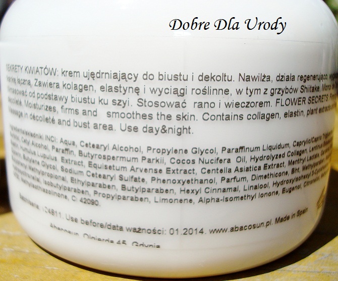 Krem od pierwszego użycia mi bardzo spodobał się, lubię kosmetyki, które działają, lecz nie obciążają skóry, nie są wyczuwalne. Krem Flower Secrets zdecydowanie do takowych należy. Naniesiony na skórę, z łatwością się ślizga po niej, co ułatwia aplikacje, bo nie muszę naciągać skóry, tylko delikatnymi ruchami rozprowadzam krem od biustu do szyi, błyskawicznie wchłania się, nie pozostawiając żadnego wyczuwalnego filmu ochronnego ani tłustej warstewki, bez obaw można natychmiastowo założyć biustonosz lub ubrania. Od razu po zastosowaniu kremu skóra staje się delikatna, miękka i jedwabiście gładka, krem delikatnie napina ją, poprawia wygląd, dobrze nawilża, uelastycznia i regeneruje. Miły i przyjemny kwiatowy zapach umila stosowanie, długo też pozostaje na skórze.