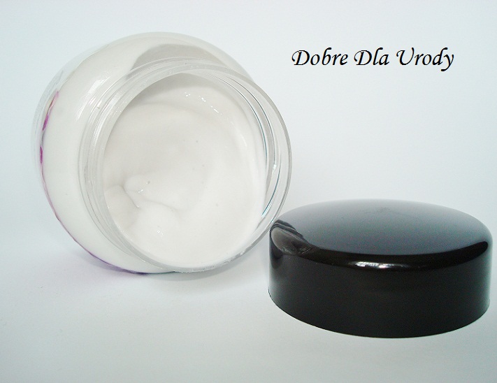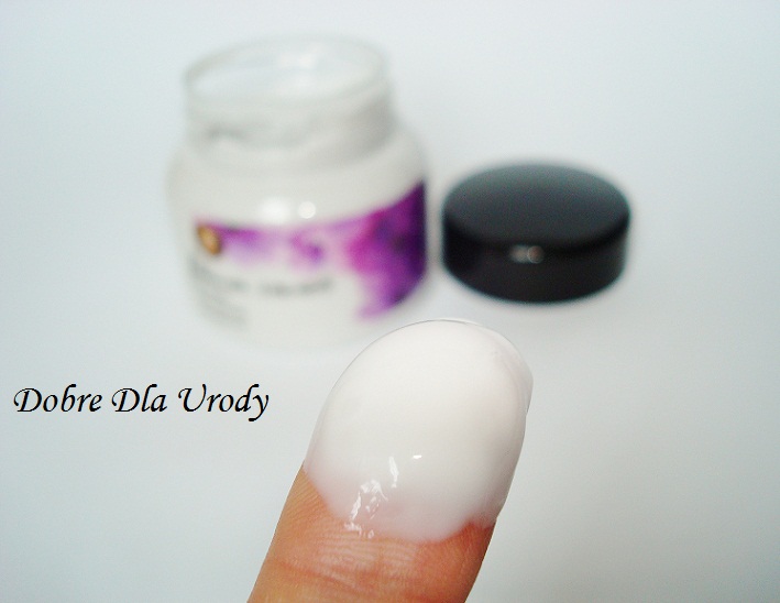 Krem o lekkiej ” jogurtowej ” konsystencji, półpłynny, nie jest bardzo gęsty, jak masło, ale też bardziej treściwszy od balsamu, ma delikatnie szarawą barwę z widocznym połyskiem.