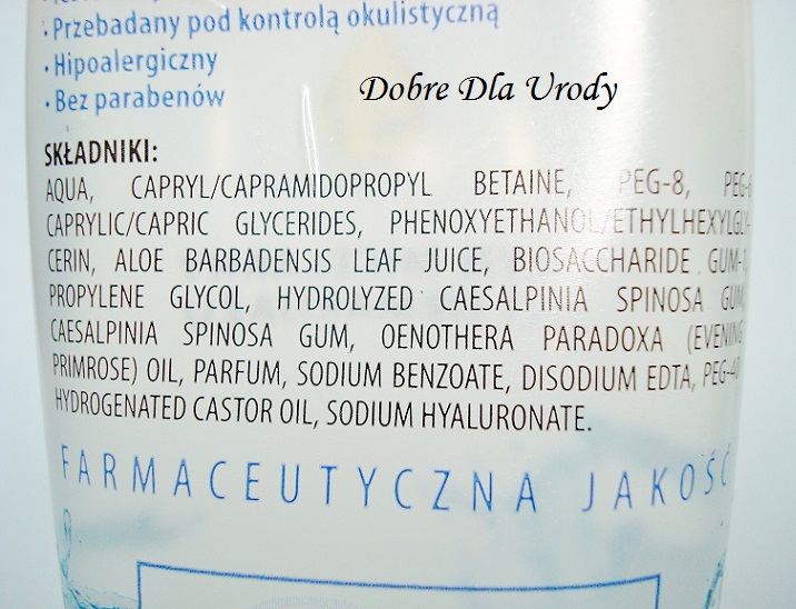 Na buteleczce znajdziemy skład produktu, wskazania do stosowania, sposób użycia, opis działania, prócz tego informację, że preparat jest farmakologicznej jakości, testowany dermatologicznie oraz przebadany pod kontrolą okulistyczną, hipoalergiczny i nie zawiera parabenów – to dobrze! Wyszczególniony jest termin ważności oraz zamieszczone dane producenta – czyli wszystko, co trzeba, wyczytamy z opakowania.