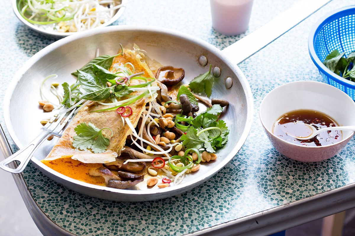 Wymieszać sok z limonki, sos rybny, cukier i chili w misce. Odstawić. Rozgrzać 1 łyżkę oleju na patelni, dodać grzyby i smażyć, mieszając, przez 4-5 min., aż się zarumienią. Odstawić na bok. Wytrzeć patelnię ręcznikiem papierowym. Rozbić jajka z kurkumą w misce, doprawić. Rozgrzać patelnię, dodać 2 łyżeczki oleju. Wlać połowę masy jajecznej i zamieszać, aby pokryć patelnię. Smażyć, aż masa będzie prawie gotowa, a następnie umieścić połowę pieczarek na środku i złożyć, tworząc półkole. Przełożyć na ciepły talerz. Przygotować drugi omlet. Na wierzch każdego omletu położyć kiełki fasoli, posiekaną cebulę i zioła, polać dressingiem i posypać orzeszkami ziemnymi. Podawać z resztą dressingu osobno.