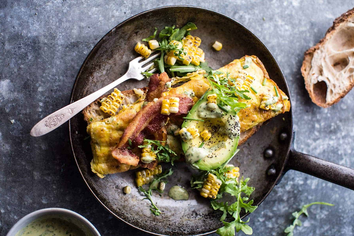 W misce widelcem roztrzepać jajka ze szczyptą soli i pieprzu. Wmieszać szczypiorek. Rozgrzać dużą patelnię, dodać 1 łyżkę masła i wlać połowę masy jajecznej. Smażyć 1 minutę i posypać połową suszonych pomidorów. Odczekać, aż jajka się prawie całkowicie zetną, a następnie dodać połowę sera na środek omletu. Za pomocą szpatułki delikatnie oddzielić spód omletu od patelni i przełożyć na talerz. Natychmiast złożyć obie strony omletu. Przygotować 2 omlet. Ułożyć każdy omlet na kromce tostowego, posmarowanego masłem chleba. Dodać garść rukoli, grillowaną kukurydzę, plasterek lub dwa boczku oraz awokado posypane solą i pieprzem. Skropić każdy omlet sosem tahini.