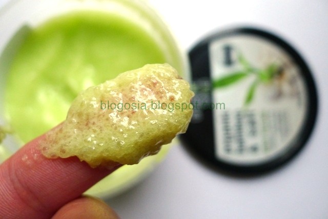 Konsystencja peelingu jest gęsta, zwarta i trochę gumiasta. Nie ma szans na to, żeby produkt poprzez swoją konsystencję wylał się z opakowania, nie ma również problemu z samym nabieraniem na dłoń. W peelingu zatopionych jest wiele drobinek soli, które widać na poniższym zdjęciu. Bardzo wygodnie się go nakłada, a na ciele podczas masażu przybiera postać bardziej kremową i białą.