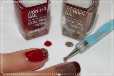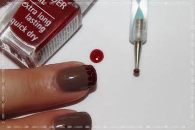 3. Na końcówkach sondą robimy kropeczki. Na czterech 641 Femme Fatale, a na serdeczny 708 Cool Camel.
