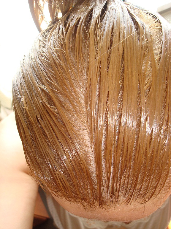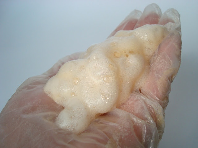 Pianka jest bardzo fajna, delikatna, jednolita, wygodna w aplikacji, wyciska się za pomocą nacisku na butelkę z dziubkiem, która jest wykonana z miękkiego plastyku, więc nie sprawia to zbytniego trudu, odrobinę farby wyciskałam na rękawiczkę i nakładałam na lekko zwilżone włosy. Szybko, sprawnie i bezinwazyjnie, ponieważ pianka nie ocieka, nie spływa z włosów i momentalnie wchłania się w nie.