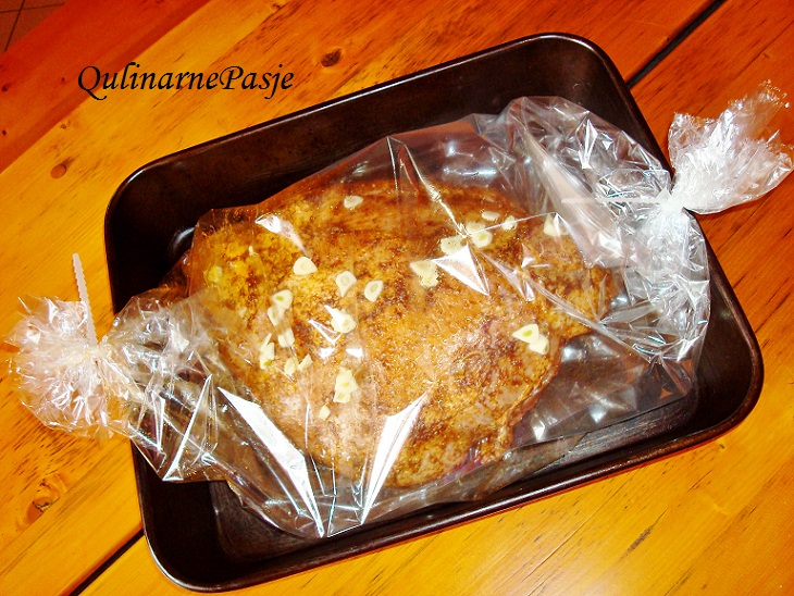 Piekarnik nagrzać na 200 C, mięso włożyć do odpowiedniej wielkości odciętego rękawa, posypać pokrojonym w plasterki czosnkiem, zamnąć rękaw z obydwu stron za pomocą klipsów, pamiętając, aby w środku rękawa było jak najwięcej powietrza, nakłuć w 2 – 3 miejscach, wyłożyć na brytfannę i wstawić do rozgrzanego piekarnika. Po 20 min., zmniejszyć temperaturę na 180C piec ok. 1,5 godziny.
