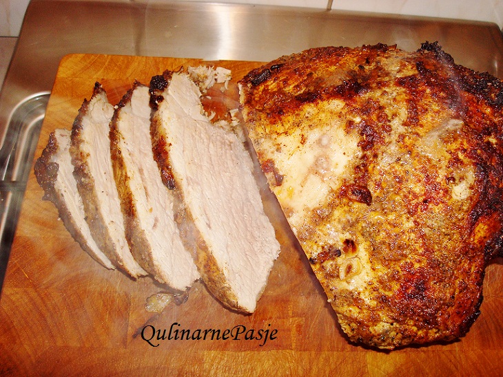 Pod koniec pieczenia, rozciąć wzdłuż, po środku, rękaw i przypiec mięso z góry, ale to niekonieczne.