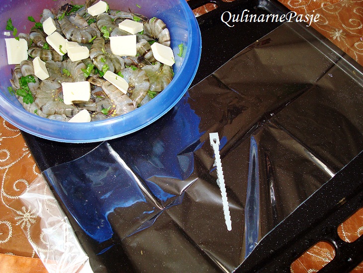 Krewetki opłukać, osuszyć, oprószyć solą, pieprzem, imbirem. Pietruszkę pokroić drobno, zostawiając kilka listków do ozdoby, dodać do krewetek, delikatnie wymieszać, dodać pokrojone w kostkę masło, delikatnie, za pomocą łyżki włożyć krewetki do środka rękawa, wlać wino, zamknąć za pomocą klipsy zostawiając w środku jak najwięcej powietrza, i wyłożyć na brytfannę. Nakłuć torebkę w 2 – 3 miejscach.