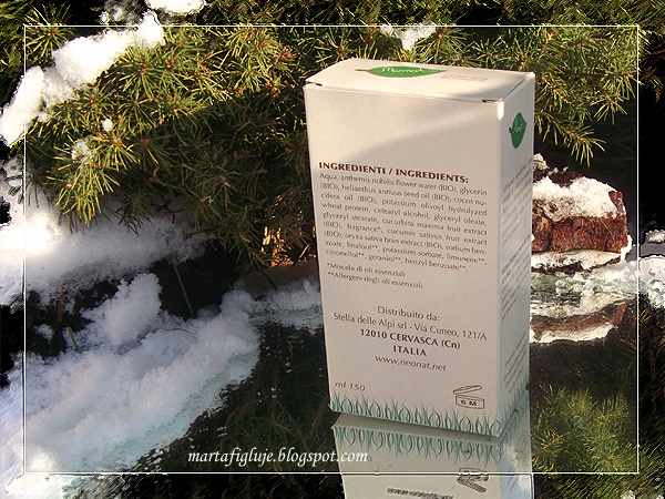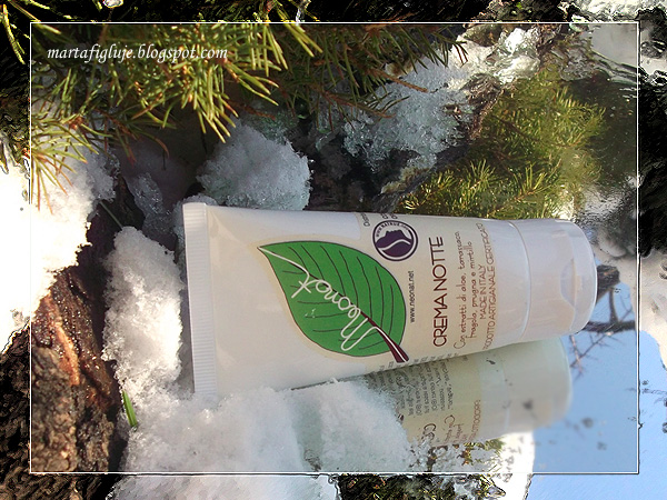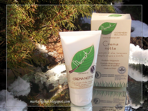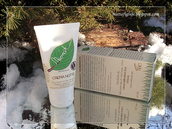Crema notte Neonat (krem na noc z aloesem) to typowy krem nawilżający, również niezwykle delikatny i kojący. Podobnie jak balsam zamknięty jest w białej tubce z charakterystyczną naklejką z listkiem (piękny design), z otwieranym korkiem. Pojemność tubki to 50 ml. Znajdziemy tu również kartonowe pudełeczko z dokładnym opisem i bardzo wyraźnie wyróżnionym składem. Podkreślam tę cechę dlatego, że te maleńkie czcionki umieszczone na wielu pudełkach po prostu mnie drażnią, a odczytanie ich stanowi dla mnie problem. Tutaj wszystko jest przejrzyste i czytelne, za co jestem bardzo wdzięczna producentowi.
