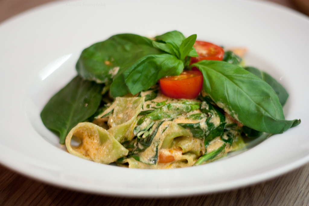 Nie zawiedliśmy się :) Ja wybrałam pappardelle alla Cozzi, czyli zielony makaron pappardelle z pomidorkami cherry karmelizowanymi brązowym cukrem, z młodym szpinakiem i serem ricotta w cenie 26 zł. Danie było bardzo w moich smakach, lekko słodko, pomidorowo, z rozpływającą się ricottą i zieleninką. Całość bardzo smaczna i syta, w szczególności po obfitej przystawce :). Brakowało mi tylko łyżki do jedzenia makaronu, ale sobie poradziłam :).