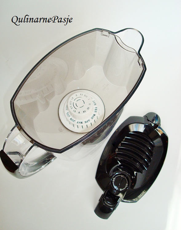 Na pewno zauważyliście na wkładzie filtrującym liczby oraz litery, nas to bardzo zainteresowało, ponieważ już widzieliśmy wiele różnych wkładów filtrujących, ale z takim spotkaliśmy się pierwszy raz. Najpierw pomyśleliśmy, że jest to ozdoba, ale nie, w ulotce wyczytaliśmy, że jest to kalendarz mechaniczny i służy do tego, aby nie zapominać na czas wymieniać wkład, w przypadku dzbanków bez wbudowanego wskaźnika zużycia. A działa w bardzo prosty sposób, wkład ustawia się w dzbanku tak, aby strzałka, która znajduje się na na lejku, wskazywała nazwę trwającego miesiąca, a rysunek z ilością figurek równał się ilości osób, które będą korzystać z filtra, po tych ustawieniach wskaże się nam miesiąc, w którym należy wymienić wkład na nowy – pomysłowe prawda.