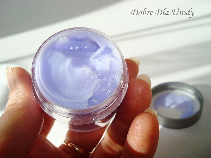 Maska o kremowej, gęstej, ale bardzo delikatnej konsystencji i jasnofioletowym zabarwieniu z połyskiem.
