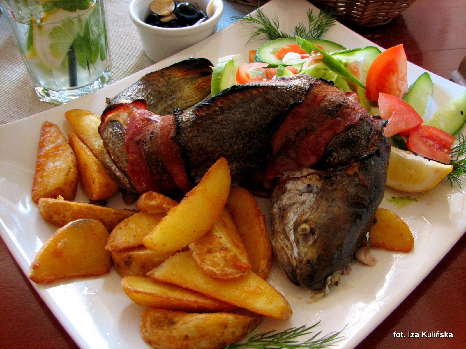 Głównym daniem był Pstrąg z pieca zawijany w bekon, z dodatkiem smażonych ziemniaków i sałatki (31 zł). Ryba smakowita, pachnąca cytryną i rozmarynem bo to miała w brzuszku. Ziemniaki niestety z mrożonki.