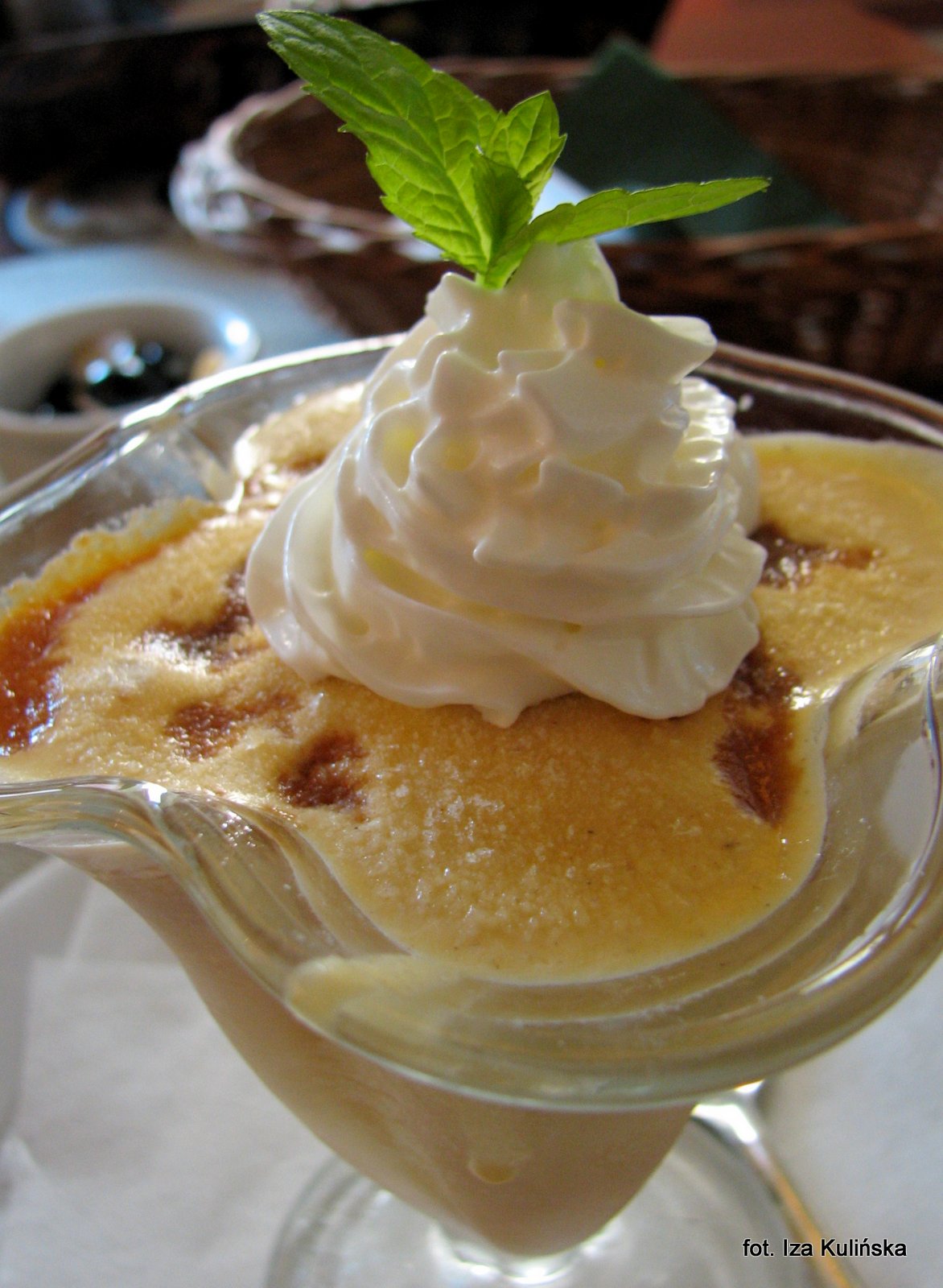 Na deser zamówiłam zachwalane Lody kawowo-chałwowe (17 zł). Kelner bardzo je polecał mówiąc, że przygotowywane są na miejscu. Skusiłam się bo lubię lody. I przyznam, że to było rozczarowanie dnia – lody owszem, są przygotowywane w Oliwce, ale z niewiadomego powodu zamraża się je po nałożeniu do pucharków, razem z naczynkiem, co powoduje, że zbyt mocno zamarzają i tracą puszystość. Przybrania śmietaną w sprayu nawet nie skomentuję … Jednak po zwróceniu uwagi na te dziwne sprawy przyznano mi rację i obiecano zmiany.