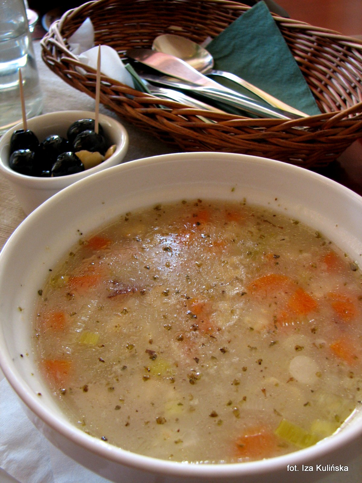 Kiedy złożyłam zamówienie kelner przyniósł miseczkę oliwek doprawionych ziołami i czosnkiem na przekąskę oraz szklankę bardzo smacznej lemoniady z miętą. Po chwili dostałam Krupnik (8 zł) – nieco zbyt tłusty i z dodatkiem kiełbasy co było jak dla mnie trochę dziwne – po prostu jestem przyzwyczajona do innej wersji. Jednak zupa mi smakowała.