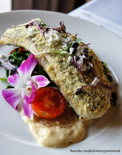 Drugie danie to dwie pozycje. Tusza dorsza w ziołowej panierce, pięknie podana delikatna ryba, z sosem holenderskim i genialnym szpinakiem, który najbardziej mężowi smakował.