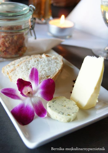 Na przystawkę zaserwowano nam podwędzany befsztyk tatarski na trocinach jabłoni, podany w zamkniętym słoiczku, po otworzeniu, którego wydobył się wędzarniczy dym. Smak mistrzostwo świata. Lokalny chleb, który był dodatkiem, dawno tak pysznego nie jadłam.