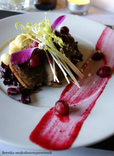 Ja zdecydowałam się na pierś z kaczki w confit malinowym, z gnocci i pyszną kapustą glazurowaną. Danie pięknie podane, pierś smaczna jednak zbyt mało był jak dla mnie wyczuwalny smak malin za to za bardzo smak żurawin.