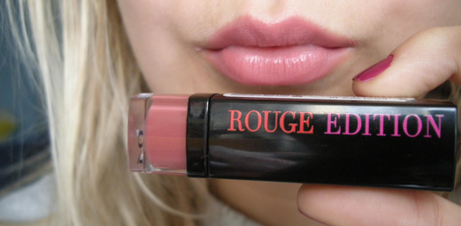 Kolor na opakowaniu, a kolor na ustach troszkę się różnią, ale to dobrze, bo taki subtelne kolory idealnie pasują dziewczynom o mojej urodzie – czyli bardzo jasnym blondynką o troszkę ciemniejszej karnacji.