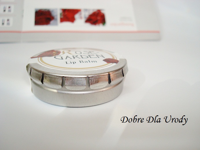 Oto i on – Balsam do ust Rose Garden, o pięknej barwie i niesamowitym aromacie róż, takim prawdziwym, nie syntetycznym! Na pierwszy rzut oka, a i w rzeczywistości też, jest bardzo gęsty, wręcz twardy, mam skojarzenia że jest to wosk, o lekkim połysku, natomiast przy kontakcie z palcem, a potem z ustami, diametralnie zmienia swoją konsystencję – staje się lekki, delikatny, niczym oliwka lub olejek, który z łatwością rozprowadza się na ustach i natychmiastowo zapewnia im komfort, miękkość, delikatność… Jest po prostu niesamowity!