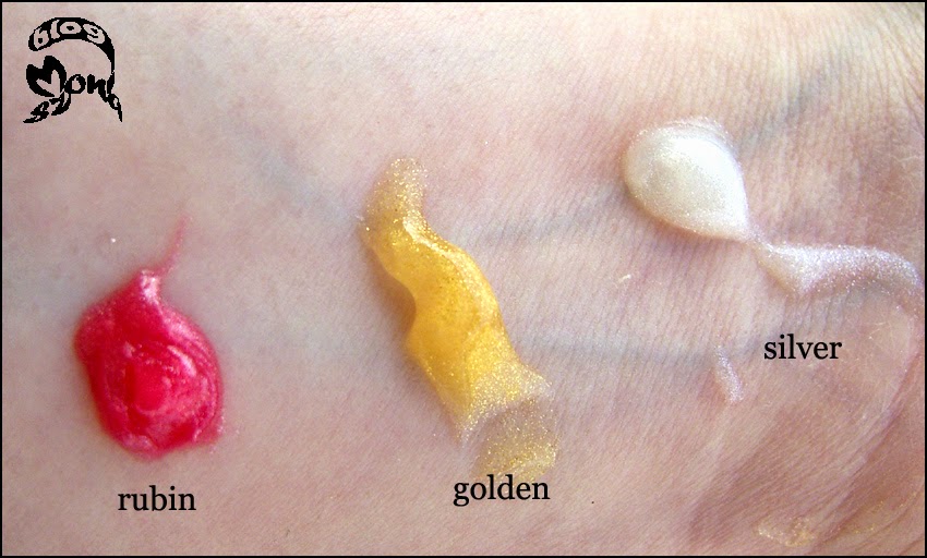 Silver bardzo ładnie wygląda na jasnej skórze, Golden bardziej pasuje do skóry już opalonej. Rubin jest najbardziej uniwersalny, ale pewnie dlatego, że różowe drobinki lepiej wtapiają się i tak nie błyszcza jak srebro czy złoto.
