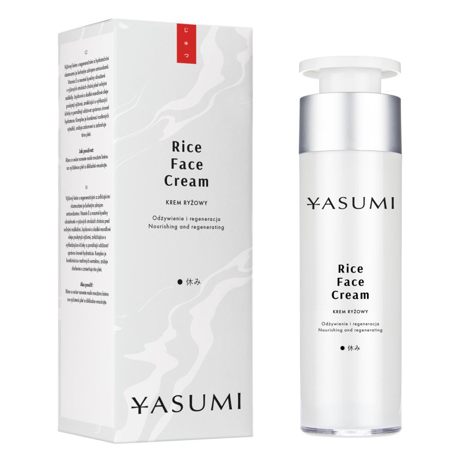 Yasumi Rice Face Cream – odżywczy krem do każdego rodzaju skóry. Zaspokoi potrzeby cery wymagającej nawilżenia, odżywienia, regeneracji i rozjaśnienia. Zawiera mączkę ryżową, olej ryżowy, olej jojoba oraz ze słodkich migdałów, a także kompleks Biowhite® uzyskany z połączenia ekstraktów z winogron, morwy białej, tarczycy bajkalskiej i skalnicy rozłogowej. Cena 99 zł/50 ml