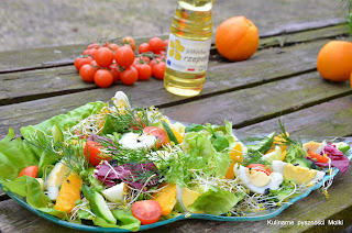 Jajka obierz pokrój w ósemki, koperek posiekaj. Kiełki na sitku przelej gorącą wodą i natychmiast wypłucz w zimnej. Osącz. Nieobrany ogórek przekrój wzdłuż na pól i pokrój w półplasterki.Pomarańcze obierz i pokrój na duże kawałki. Sok zachowaj. Wszystkie przygotowane składniki wymieszaj posól, przypraw pieprzem, skrop oliwą i sokiem z pomarańczy.