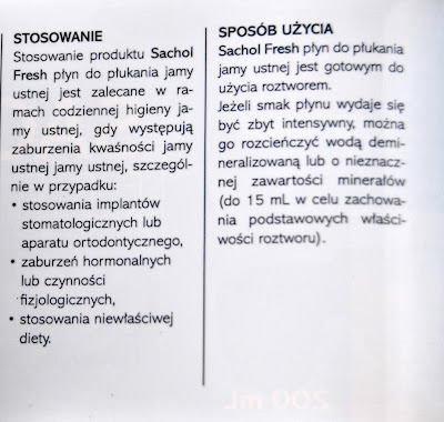 Faktycznie Sachol Fresch jest bardzo delikatnym produktem. Ma lekko miętowy, bardzo przyjemny smak. Nie zawiera alkoholu, dzięki czemu nie wywołuje nieprzyjemnego pieczenia i palenia w jamie ustnej. Nie jest kwaśny. Przy pierwszym kontakcie odniosłam wrażenia, że od razu moja jama ustna staje się sterylnie czysta. Tak jakby ją zalała fala świeżości :) Często mam problem z uczucie suchości w buzi. Zauważyłam, że przy regularnym stosowaniu płynu problem ten się zmniejszył.