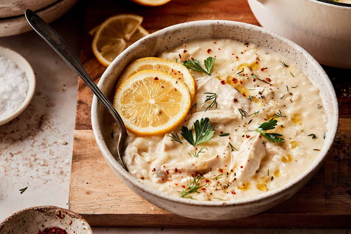 Wlać oliwę z oliwek do dużego garnka, ustawić na kuchence i dodać pokrojoną w kostkę cebulę. Smażyć przez ok. 6-7 min., następnie dodać rozgnieciony czosnek i smażyć przez kolejne 2 min. Dodać surowy ryż, bulion, tymianek i oregano i zmniejszyć ogień. Przykryć i gotować na wolnym ogniu przez 20-25 min. W osobnej, dużej misce ubić jajka, żółtka, skórkę i sok z cytryny, aż do całkowitego połączenia. Odstawić. Wlać ok. 1 szklanki zupy do miski z jajeczną masą, bardzo powoli, po kilka łyżek na raz. Stale mieszać, aby jajka się nie ścięły. Następnie przełożyć mieszankę do blendera i zmiksować do uzyskania gładkiej konsystencji. Następnie wlać mieszankę z powrotem do garnka z resztą zupy. Dodać pokrojonego w paski kurczaka oraz sól i pieprz do smaku. Udekorować natką pietruszki, koperkiem i papryką (opcjonalnie).