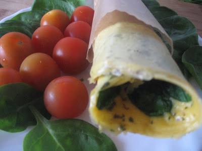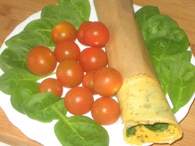 Jajka z przyprawami mieszam w shakerze, wylewam na rozgrzaną patelnię z kilkoma kroplami oleju rzepakowego. Od razu na jajka nakładam szpinak, powoli smażę. Gdy wierzch omletu widoczny pod szpinakiem jest już lekko ścięty, przewracam omlet na kilka sekund na drugą stronę. Zdejmuję z patelni, zwijam w ciasny rulonik, pakuję i zajadam w pracy. Najlepiej mi smakuje z pomidorkami koktailowymi. Jest lekko, zdrowo i całkowicie wystarczająco na przekąskę.