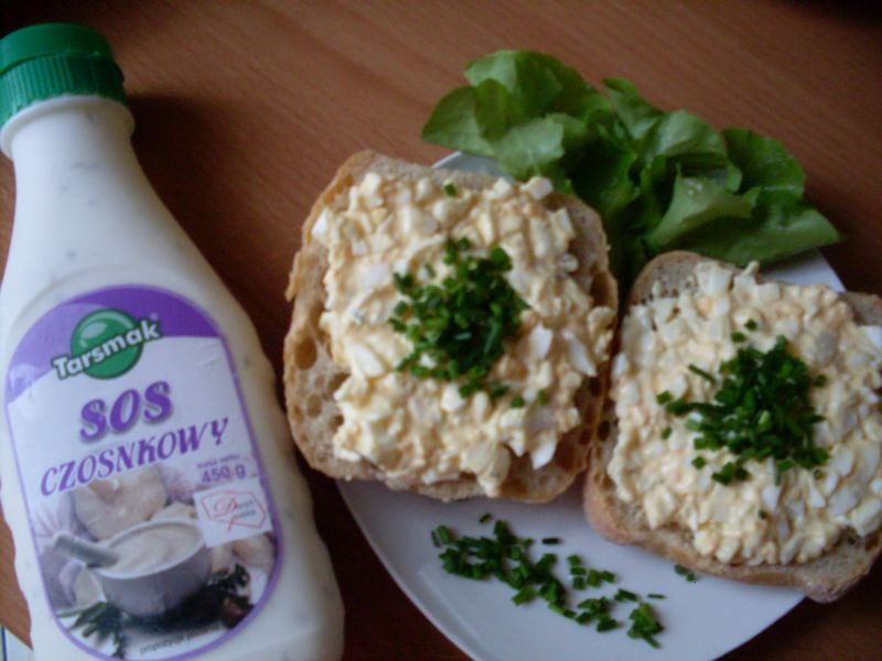 Zamiana zwykłego majonezu na sos czosnkowy sprawia, że pasta smakuje świetnie. Jajka ugotowane na twardo obieramy i kroimy w kosteczkę oraz mieszamy z sosem czosnkowym. Doprawiamy do smaku i posypujemy szczypiorkiem na wierzch (można też dodać go do jajek i wymieszać). Bardzo proste i bardzo pyszne.