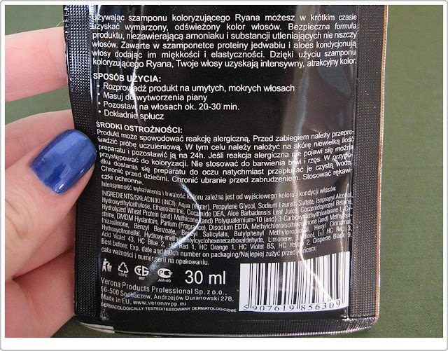 Szampon zapakowany jest w śliską, gładką saszetkę, w której znajduje się30 ml produktu. Minusem tego szamponu jest to, że nie zostały do niego dołączone jednorazowe rękawiczki ochronne, które należy nałożyć przed rozpoczęciem nakładania szamponu (taka informacja widnieje na opakowaniu). Na opakowaniu umieszczone są wszyskie istotne informacje: sposób użycia, skład, pojemność, data ważności.