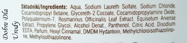 Stosuję Szampon wzmacniający od trzech tygodni, więc już zdążyłam poznać jego walory. Odrobinę szamponu nakładam na wilgotne włosy, masuję je i skórę głowy, potem spłukuję i powtarzam czynność, za pierwszym razem prawie nie pieni się, natomiast druga porcja tworzy na włosach puszystą białą pianę, która potem z łatwością spłukuje się. Po spłukaniu włosy są tak czyste, że aż ” piszczą „, szampon wspaniale oczyszcza jak włosy, tak i skórę głowy, mam trocha problem z ich rozczesywaniem, ponieważ moje włosy są średniej długości i strasznie się plączą, zawsze, ale to zawsze używam odżywki lub maski, by ułatwić ich rozczesywanie, więc nie uznaję tego za minus, bo w końcu da się rozczesać, tyle że zajmuje mi to trocha więcej czasu niżeli zazwyczaj. Po wyschnięciu włosy są pełne objętości, puszyste i fajnie się błyszczą, łatwo się układają, nie wymagając jakiejś specjalnej stylizacji.