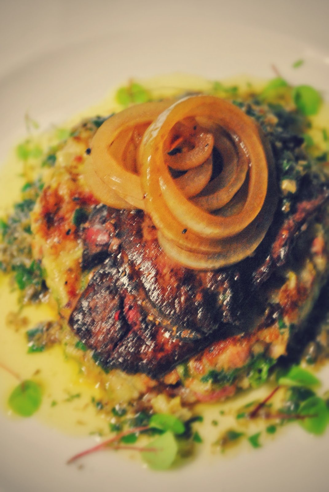Tu spróbowaliśmy dwóch różnych dań. Tagliaty di manzo, czyli wspaniale usmażonego wołowego rostbefu, z rukolą, sosem balsamicznym i płatkami parmezanu. Co tu dużo mówić – właśnie tak to danie powinno wyglądać. Drugiej „sztuczce” poświęcę więcej czasu. Wyobraźcie sobie wątróbkę z cebulą i ziemniakami. A teraz zapomnijcie o tym, jak ten klasyczny zestaw powinien wyglądać. Wyobraźcie sobie kremowe pure ziemniaczane wymieszane z chrupiącą kosteczką z boczku (wzbogaca smak, nie dodając zbędnego tłuszczu), z którego uformowano „ciastko” o chrupiącej skórce, i aksamitnym wnętrzu. Na tym ciastku, idealnie usmażony kawałek delikatnej cielęcej wątróbki, z krążkami cebuli podsmażonymi na patelni „po wątróbce” i deglasowanymi białym winem. Wszystko skropione świeżym w smaku sosem, z wyczuwalną nutą cytryny, kaparów i ziół (coś na kształt salsa verde), który podnosi smak dania na zupełnie inny poziom. Od dziś wątróbkę z cebulą jem tylko tak!