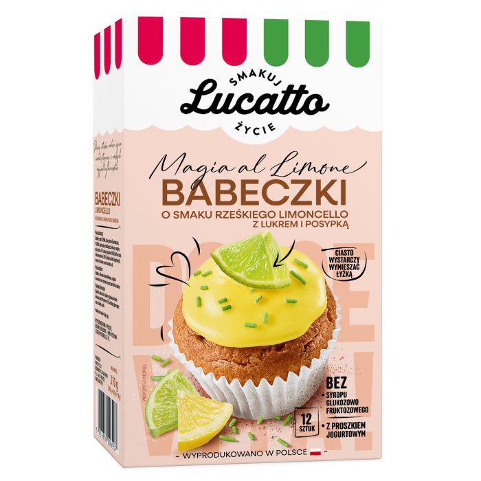 Babeczki Magia al Limone nawiązują do cytrusowej linii, łącząc aromat limoncello z cytrynowym lukrem i dekoracyjną posypką. Z jednego zestawu można przygotować 12 porcji, a dołączone papilotki podkreślają estetyczny charakter wypieków.