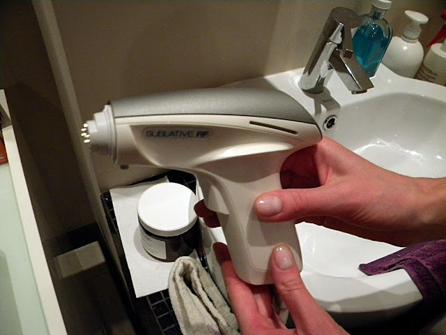 Sam zabieg jest wykonywany za pomocą specjalnego pistoletu, na który nakładana jest jednorazowa nasadka (po zabiegu Pani Małgosia zapakowała ją hermetycznie i podpisała aby poczekała na moją kolejną wizytę). Pistolecik ten przyłożony do twarzy powoduje ukłucie – uczucie gorąca jest kompletnie zniwelowane przez krioterapię ale za to czujemy specyficzny i niezbyt przyjemny zapach przypalanej skóry.