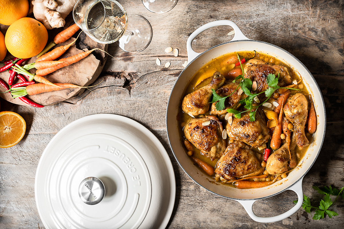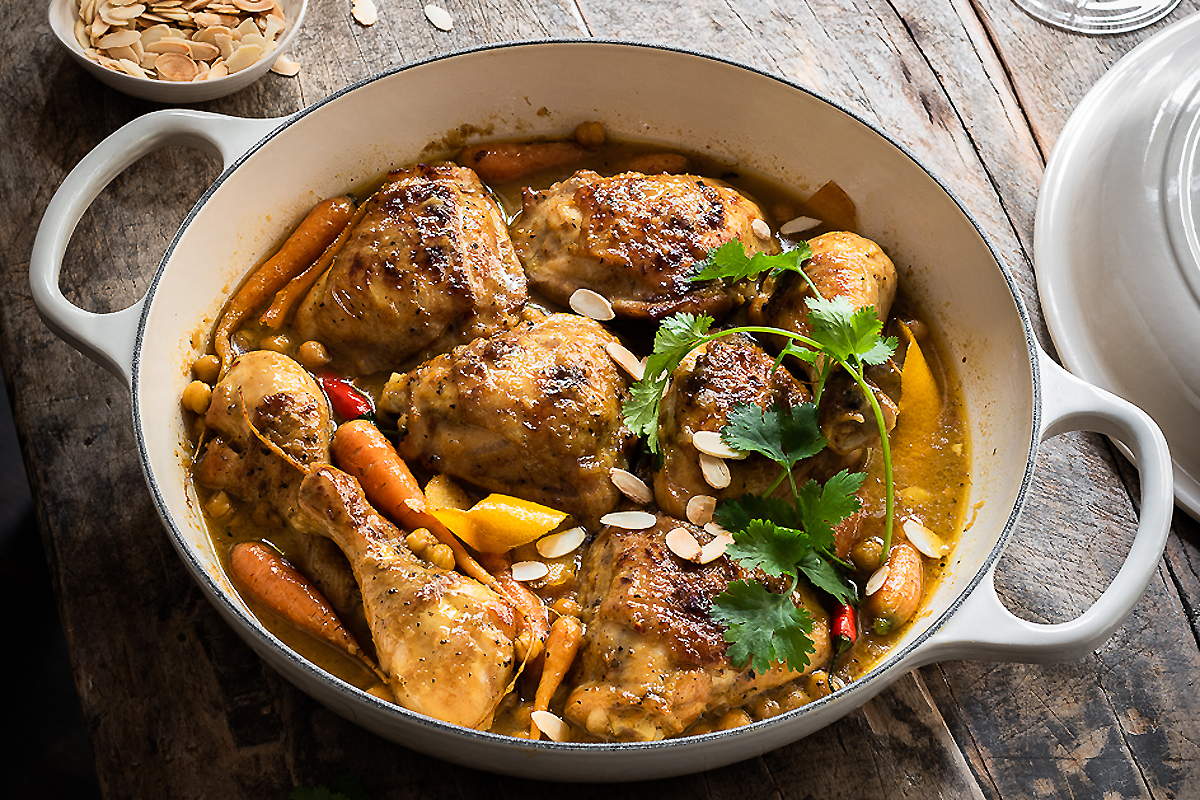 Rozgrzać 1 łyżkę oliwy. Doprawić kurczaka solą i pieprzem. Obsmażyć z obu stron na złoty kolor. Zdjąć z patelni i odstawić. Dodać pozostały olej na patelnię i podsmażyć cebulę, aż zmięknie, ok. 6-8 min. Dodać czosnek i imbir i smażyć przez kolejną 1 min. Posypać mąką i wymieszać, aby cebula pokryła się bulionem. Powoli wlewać bulion, ciągle mieszając, aż sos zgęstnieje. Dodać chili, skórkę i sok z pomarańczy, sok z cytryny, wodę szafranową i miód. Włożyć kurczaka z powrotem na patelnię wraz z pozostałym sokiem. Przykryć i gotować na wolnym ogniu przez 25 min. Dodać marchewkę i gotować przez kolejne 20 min., aż marchewka będzie miękka, a kurczak ugotowany. Dodać ciecierzycę i podgrzewać przez około 5 min. W razie potrzeby doprawić. Aby skórka kurczaka była chrupiąca, umieścić kurczaka na grillu na kilka minut. Na koniec posypać płatkami migdałów i świeżą kolendrą.