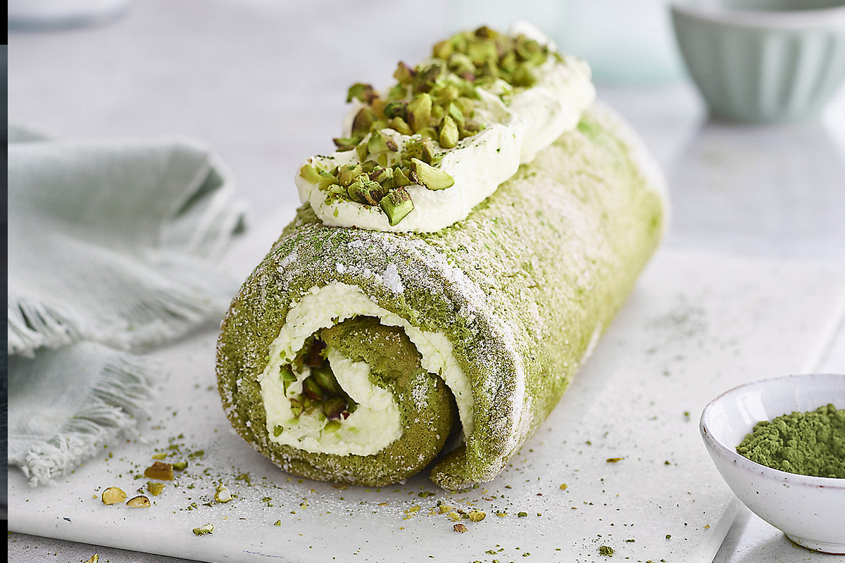 Rolada matcha z mascarpone i pistacjami