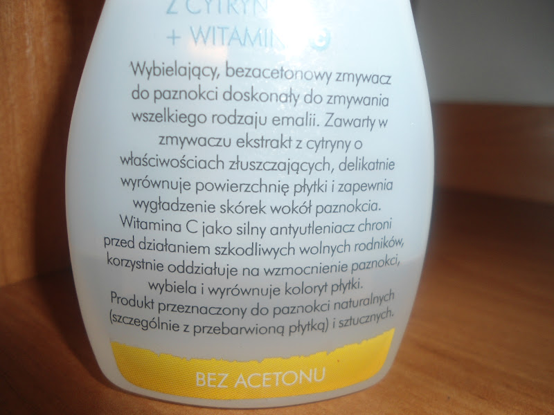 Od producenta: Wybielający bezacetonowy zmywacz do paznokci doskonały do zmywania wszelkiego rodzaju emalii. Zawarty w zmywaczu ekstrakt z cytryny o właściwościach złuszczających, delikatnie wyrównuje powierzchnię płytki i zapewnia wygładzenie skórek wokół paznokcia. Witamina C jako silny antyutleniacz chronio przed działaniem szkodliwych wolnych rodników, korzystnie oddziałuje na wzmocnienie paznokci, wybiela i wyrównuje koloryt płytki. Produkt przeznaczony do paznokci naturalnych (szczególnie z przebarwioną płytką) i sztucznych.